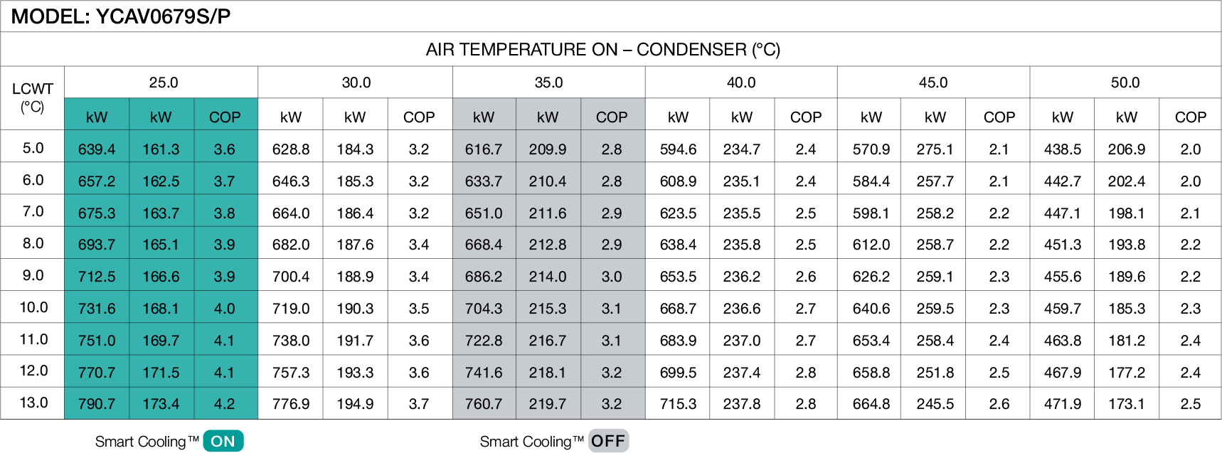 The proven results of how the chiller booster Smart Cooling™ system increases chiller efficiency are visible from data provided by chiller manufacturers. Information on chiller performance, cooling capacity, energy consumption and chiller COP is available in the form of standardized tables. These tables show the cooling capacity a unit can provide under certain ambient air temperatures, along with how much power is used in kW/h